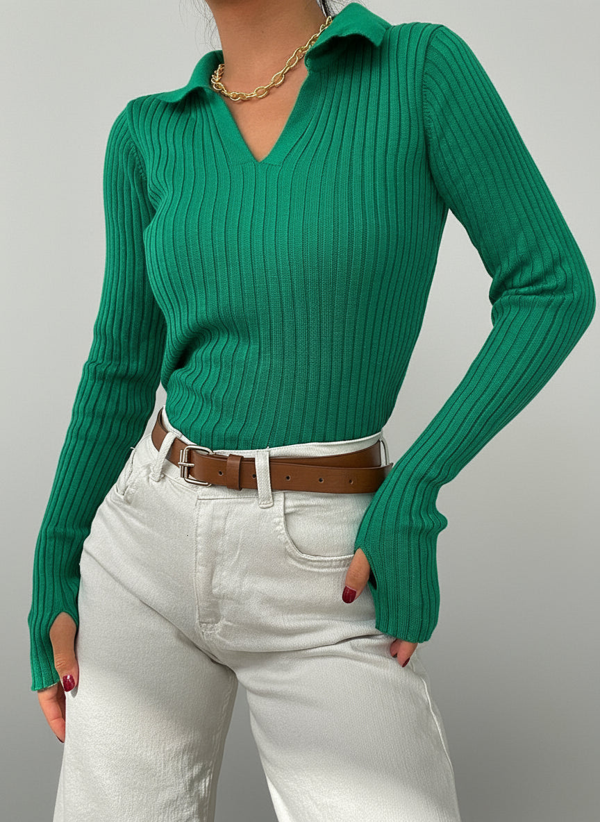 Kadın Yeşil Polo Yaka Parmak Detay Triko Bluz 2047