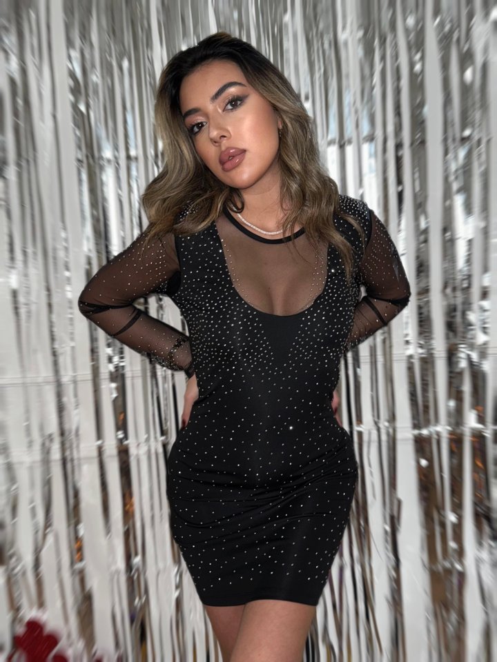 Kadın Yılbaşı özel Uzun Kollu Yuvarlak Yaka Dekolteli Taşlı Dalgıç Elbise