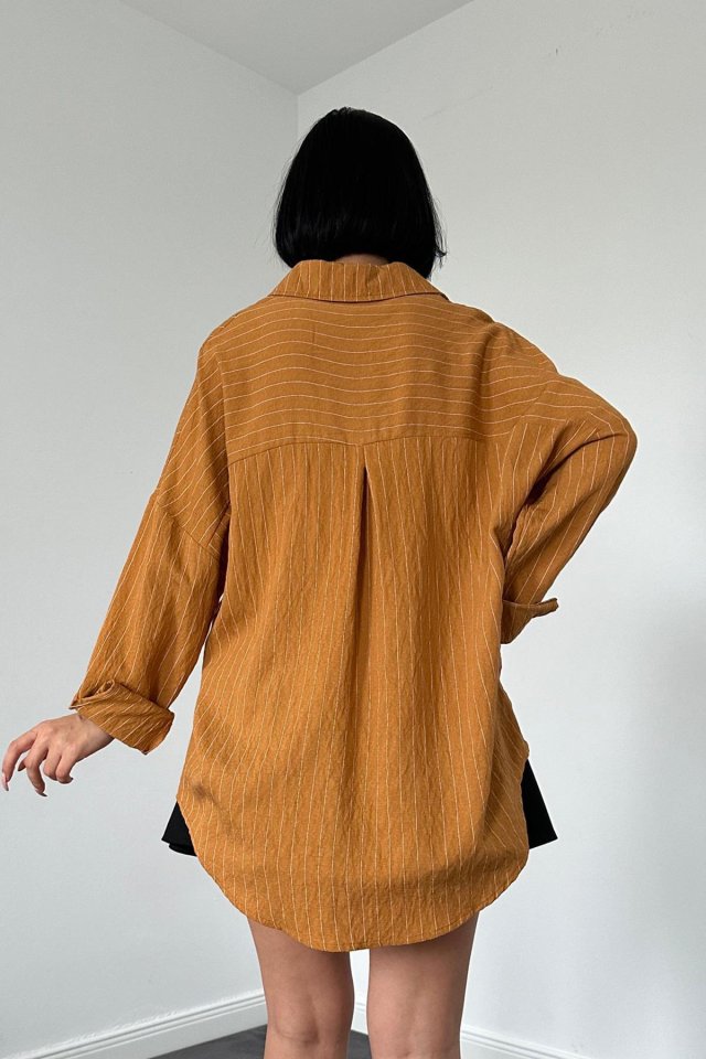 Kahverengi Çizgili Kristal Taşlı Klasik Gömlek