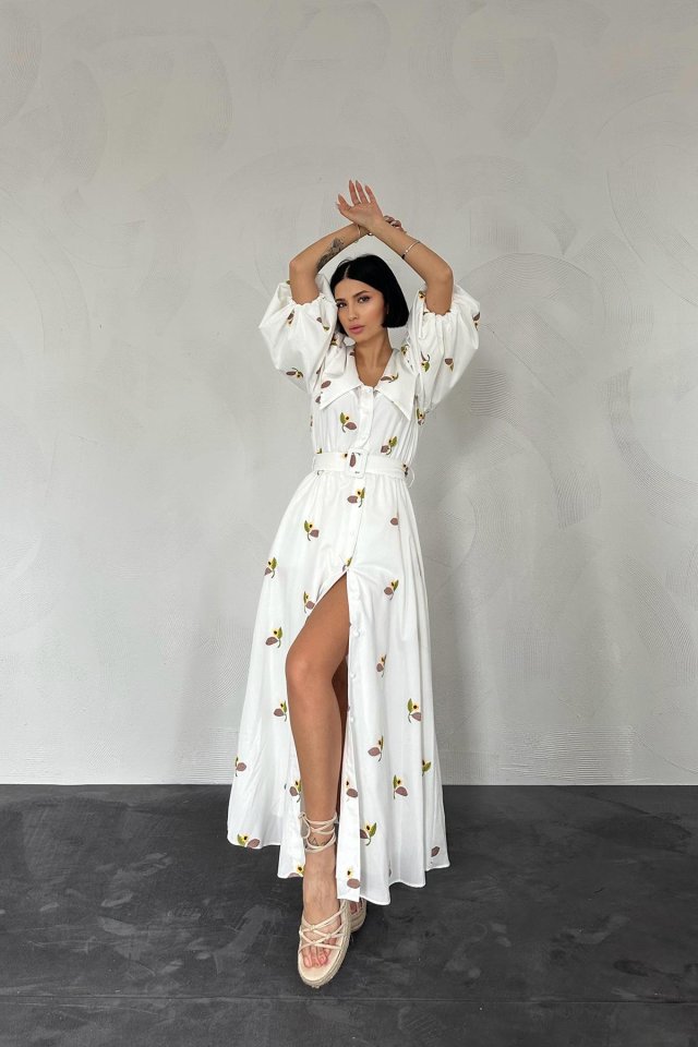 Kahverengi Yakası Çiçek Motifli Kemerli Elbise