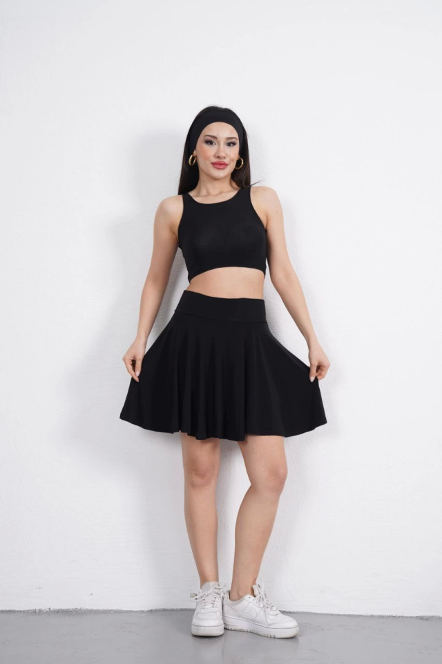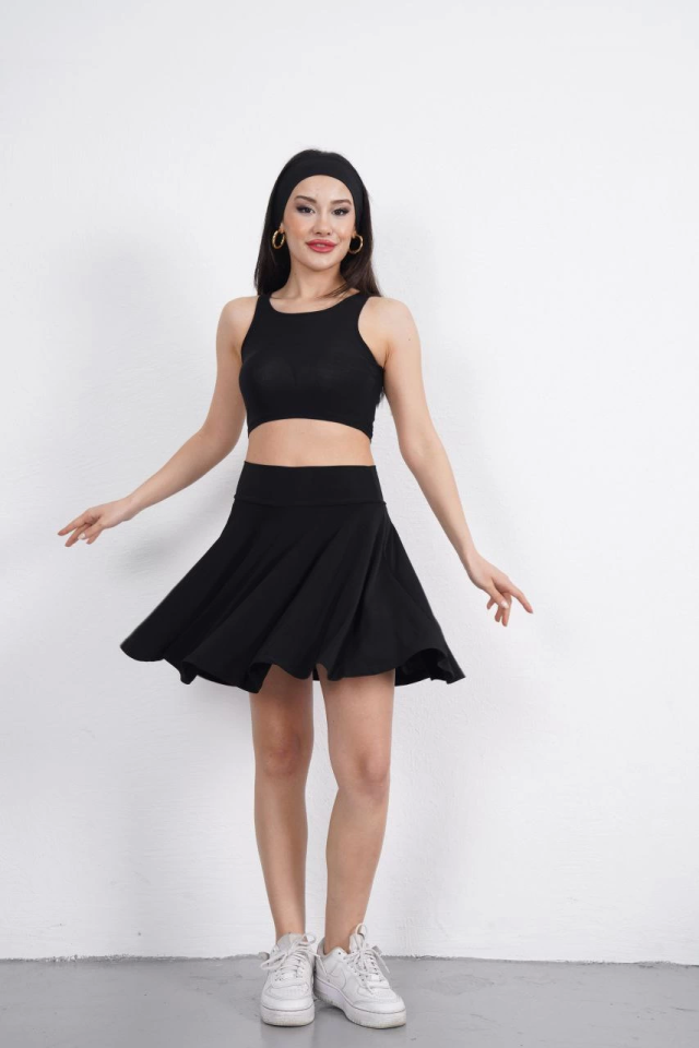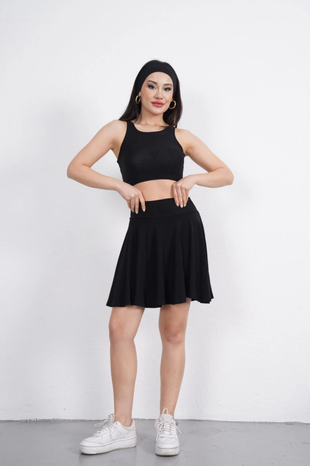 Sendy Kumaş Bisiklet Yaka Crop Şortlu Etek Ikili Takım - Siyah