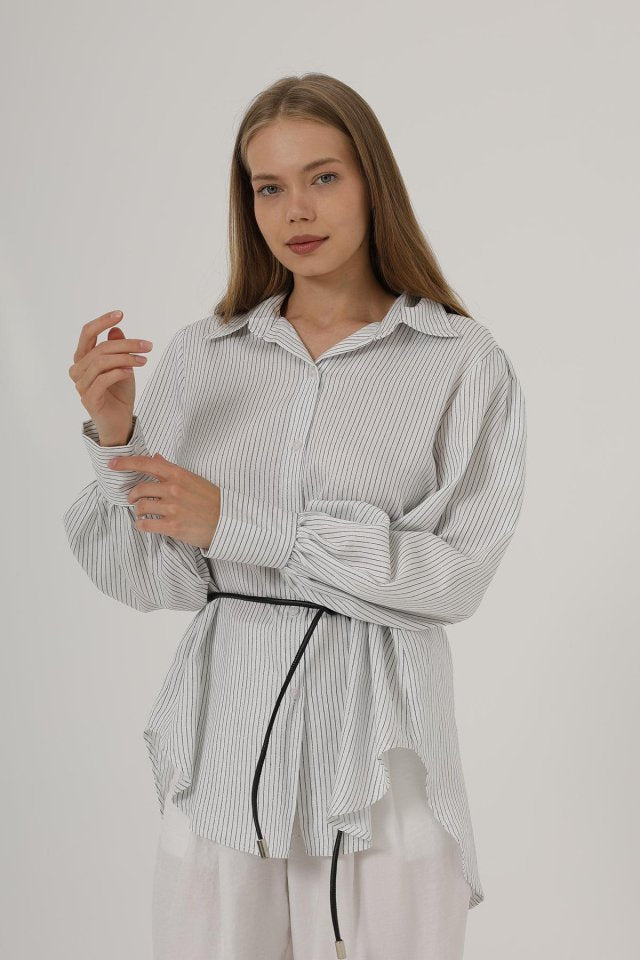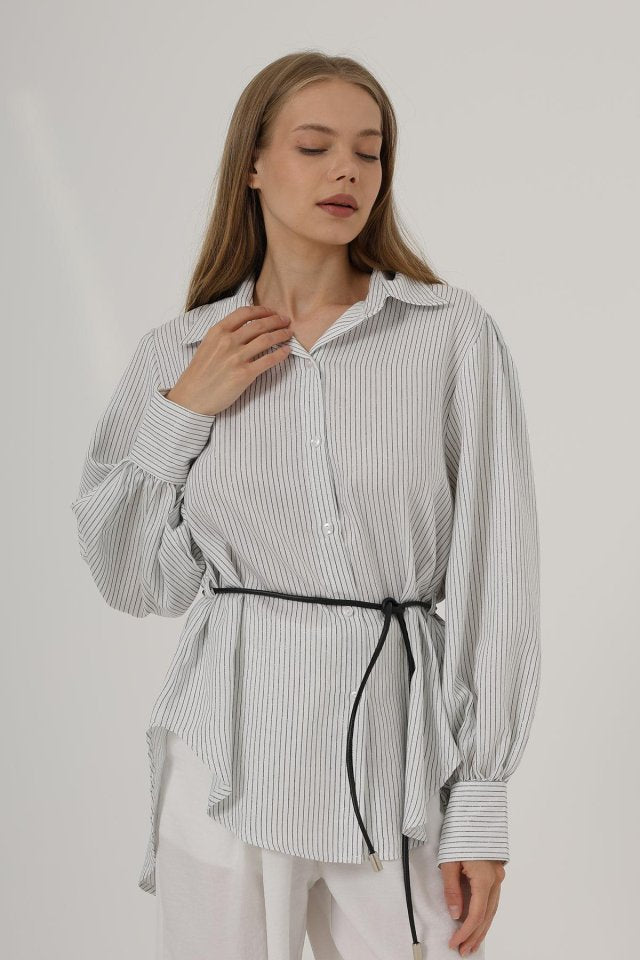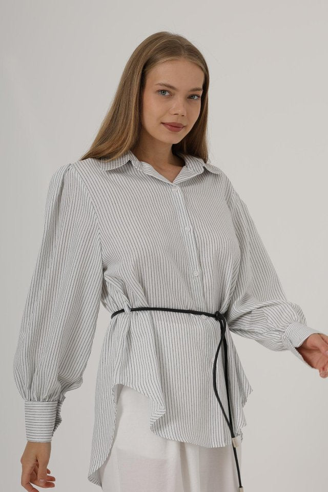 Simli Çizgili Kemerli Gömlek - Beyaz