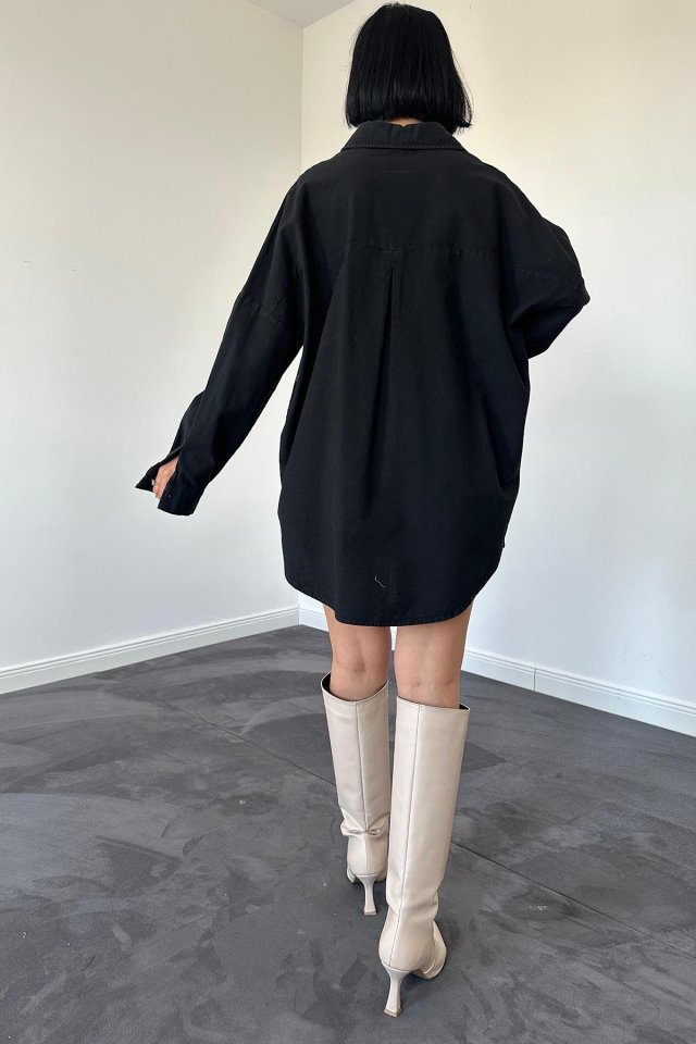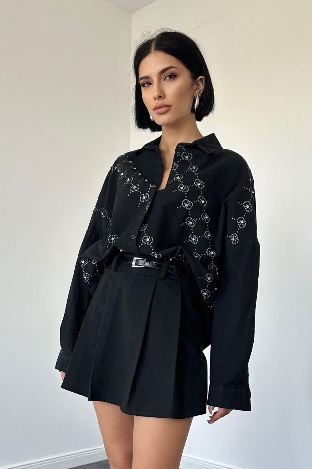 Siyah Boyamalı Keten Baskılı Taşlı Gömlek