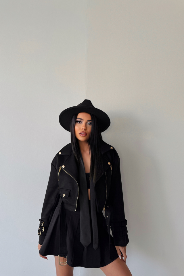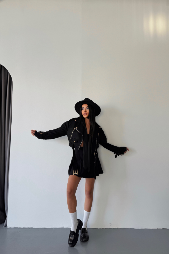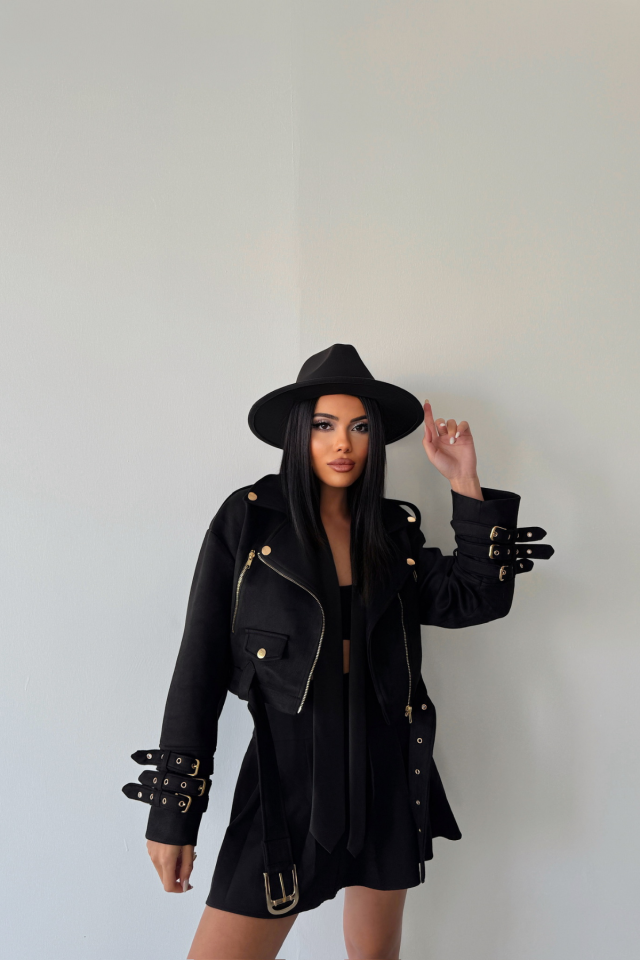SÜET CROP CEKET KOL 3 KEMER DETAYLI - Siyah