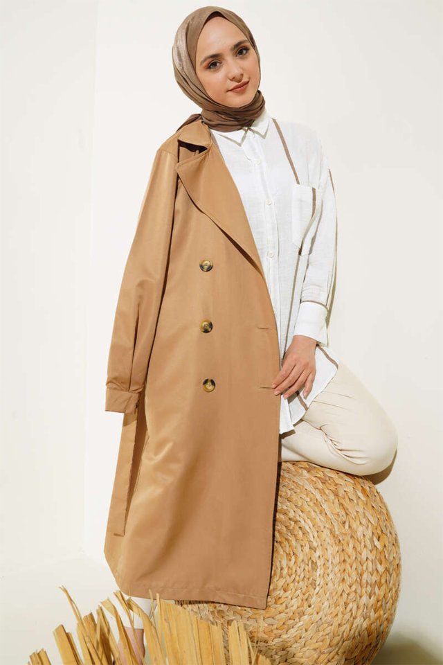 T5853 Kruvaze Yaka Tesettür Trençkot - Taba