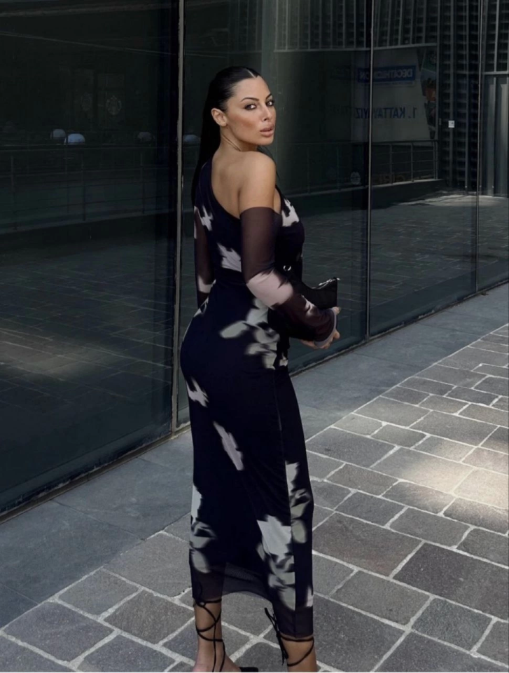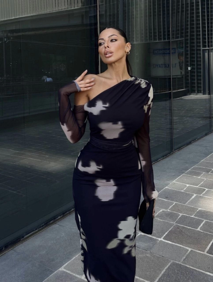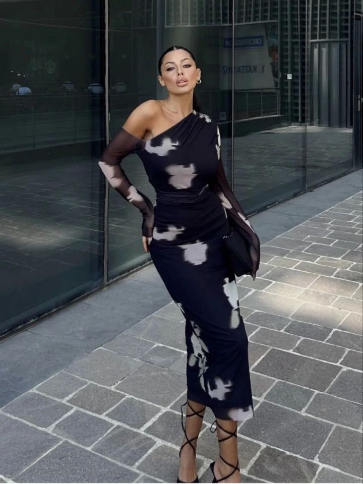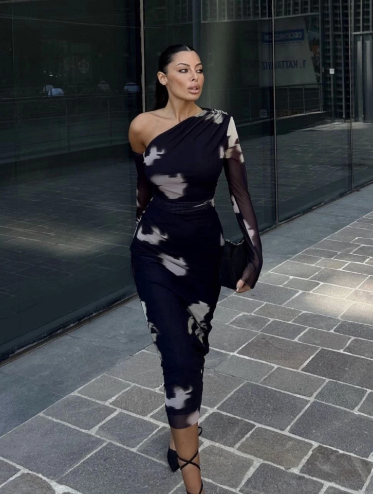Tek Omuz Asimetrik Desenli Uzun Şifon Elbise - Siyah